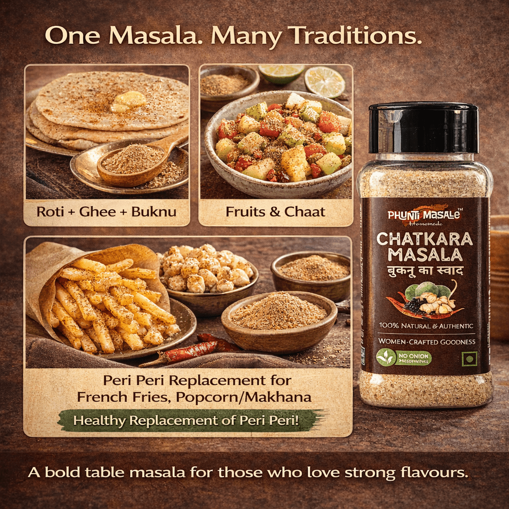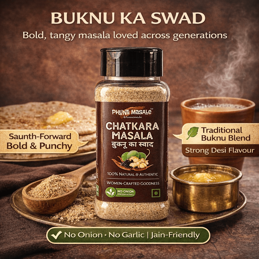 Phunti Masale Chatkara Masala – Buknu Ka Swad is a bold, tangy and pungent Indian table masala, inspired by traditional buknu blends from North India. Crafted with saunth (dry ginger), mango powder, cumin, peppers and natural salts, this masala delivers a sharp, appetite-stimulating flavour that wakes up your taste buds instantly.