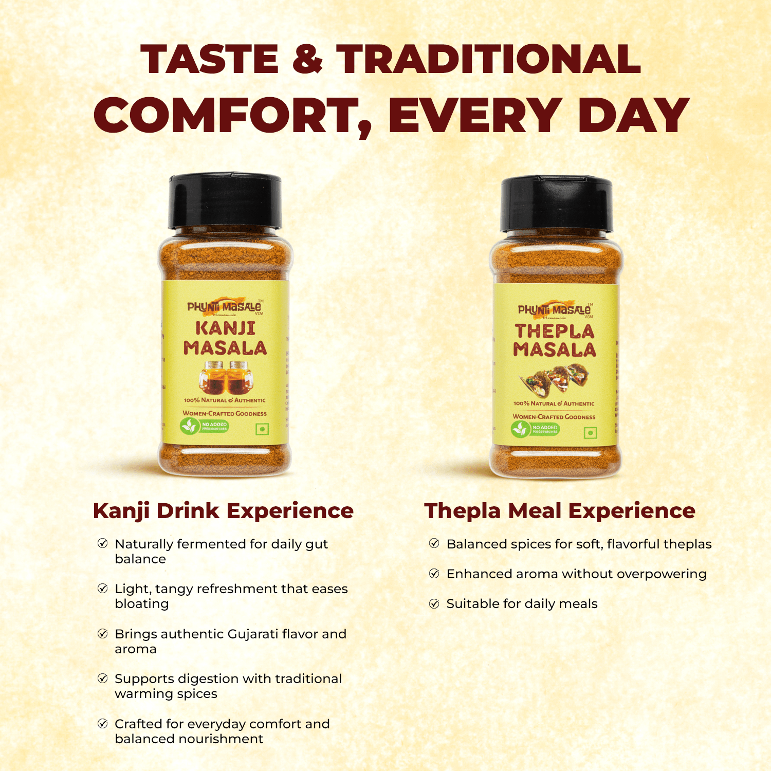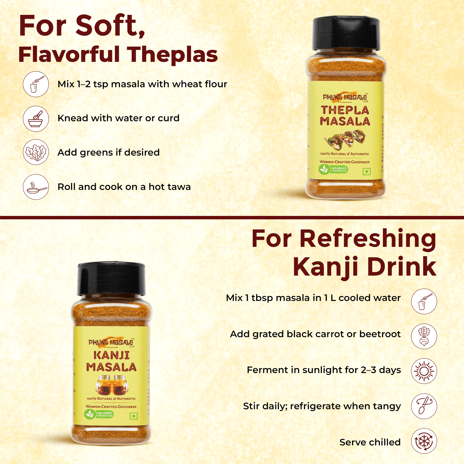 Includes 90g Thepla Masala and 100g Kanji Masala premix.