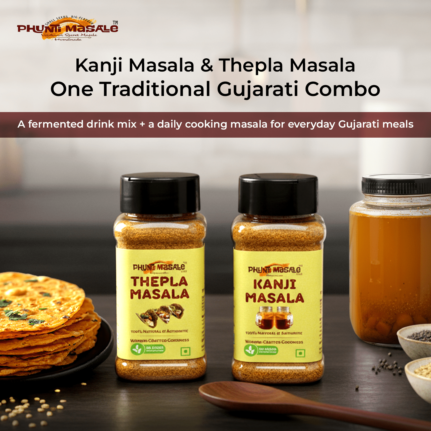Introducing the Thepla and Kanji Masala Combo by Phunti Masale VSM — a thoughtfully curated pack that brings together authentic Gujarati tradition and natural digestive wellness.